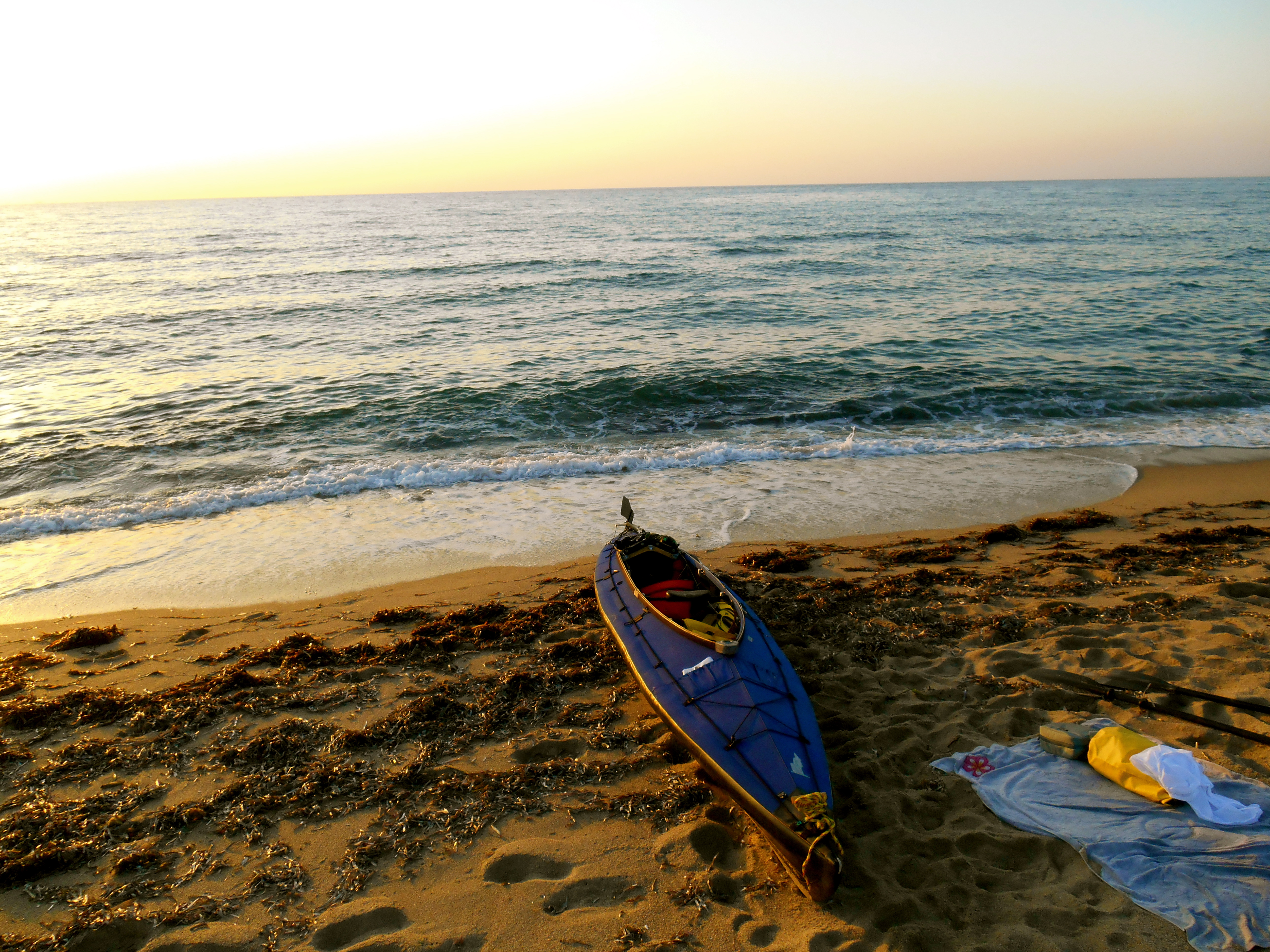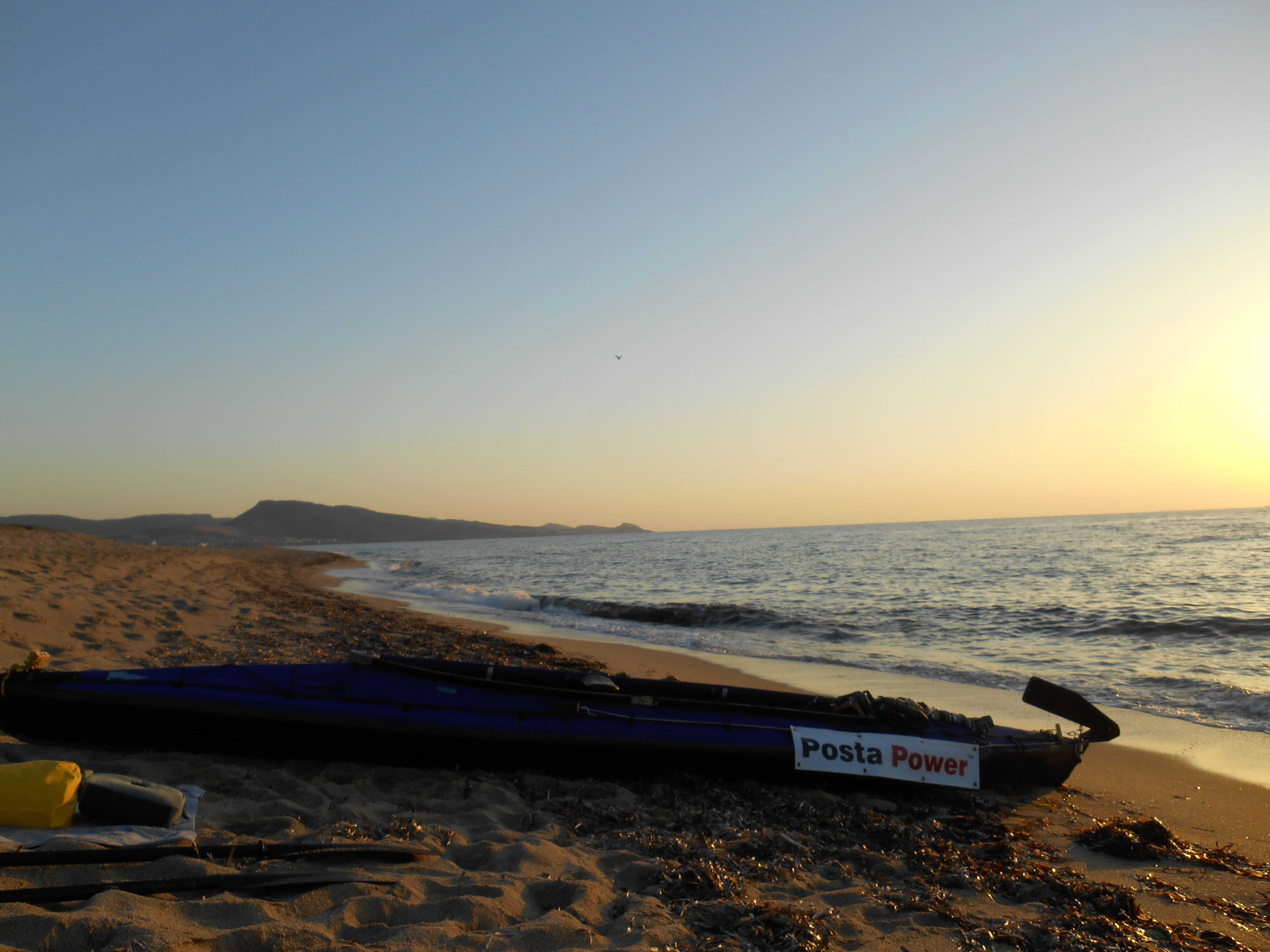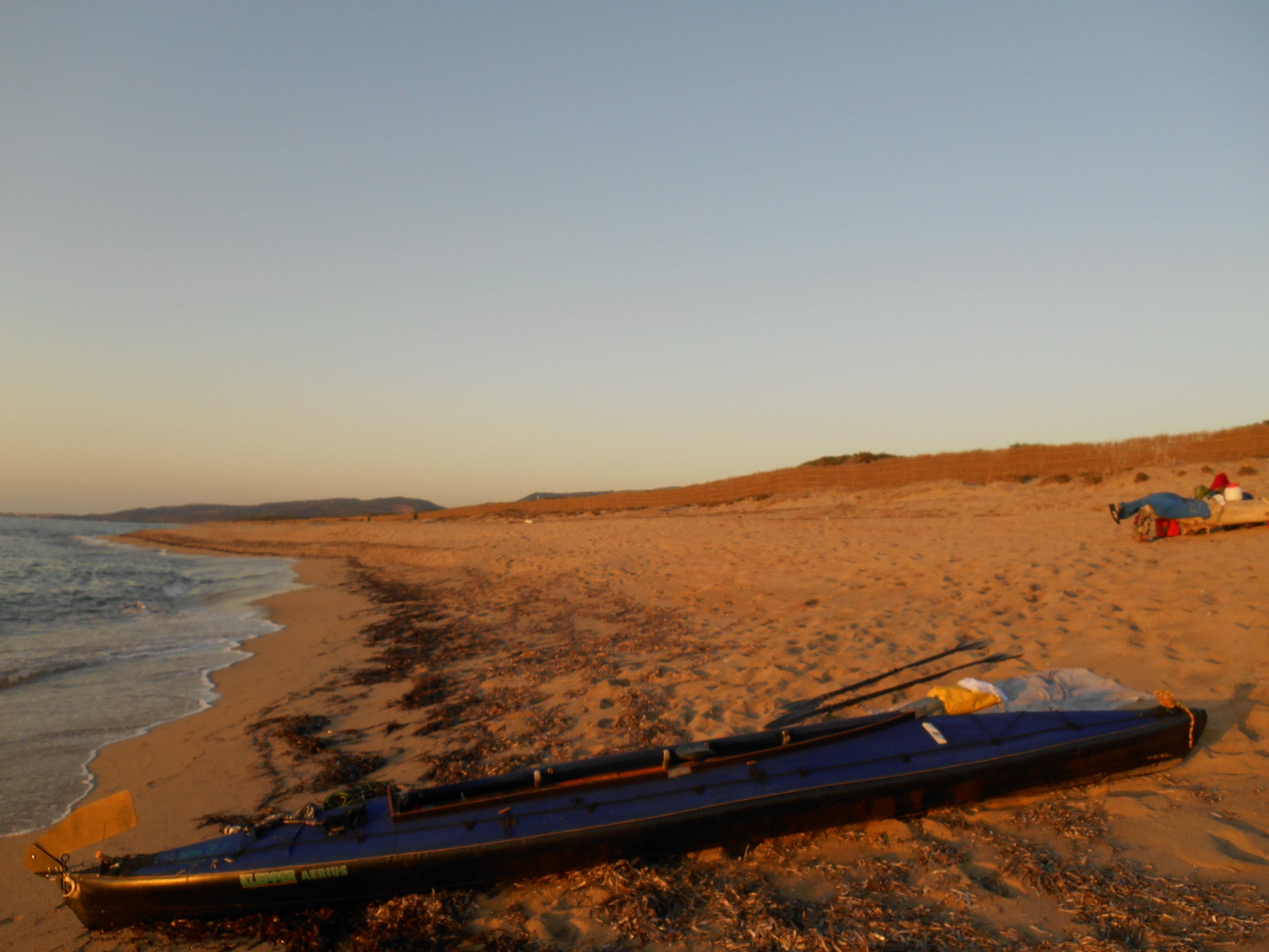 La giornata si avvicina al tramonto e i colori del cielo e della sabbia cominciano lentamente ad avvampare, noi pagaiamo a poca distanza dalla costa in modo efficace e regolare. Quando decidiamo di approdare è perché veramente i muscoli delle braccia cominciano a non rispondere, le mani accennano vesciche, il fondoschiena segnala un dolore pungente per averci sostenuto tutto il giorno.