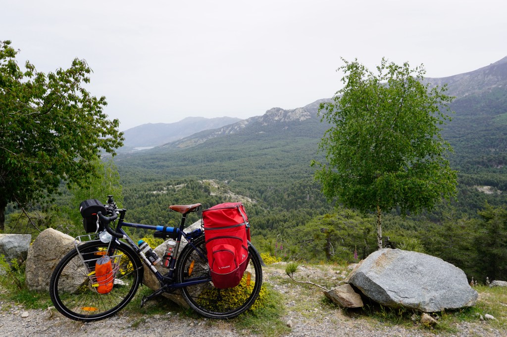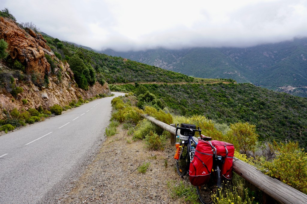 “Last summer there was a pizzeria over there, close to the camping toilets. Then it burned down.” Not only the pizzas, the whole pizzeria. You have to go to Évisa, maybe you’ll still find an open place there. “For the whole day I have fed my body with nothing more than breakfast, one pain au chocolat and one pain au raisin luckily bought when leaving the Sagone gulf. My upper stomach looks like a chasm I can’t see the bottom of. In spite of this, the eventuality to climb over the saddle again, to cycle downhill toward Évisa and then uphill to the camping again – without even being sure to find an open grocery – is a challenge my actual energy level doesn’t match with. I have pedalled for over 70 km, which is not such a long distance. But considering the 1.750 m uphill and the fully loaded bike, that number is not what it seems to be.