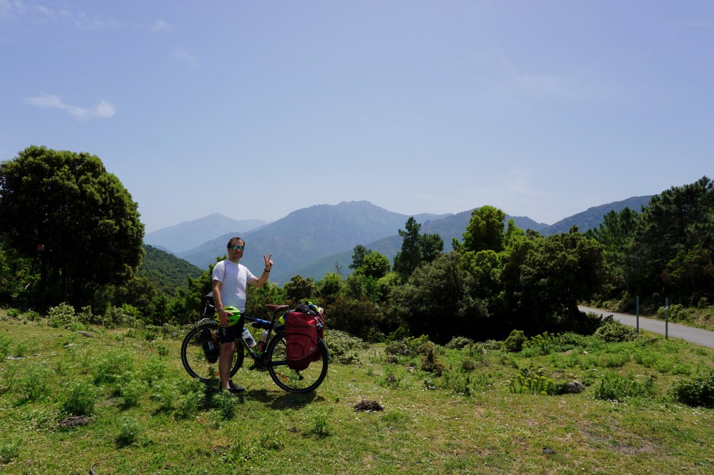 The only point worth mentioning today is my little revenge on Livio at the pass. He still has yesterday’s performance in the legs, while I seemingly have more energy and take advantage of it. I wait for him for 15 minutes at the 1.490 m of Col de Vergio, in sight of the highest Corsican peak: Monte Cinto.