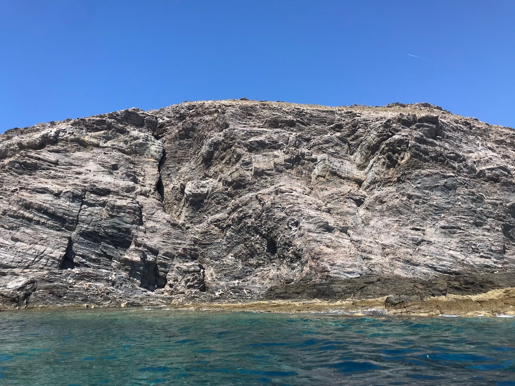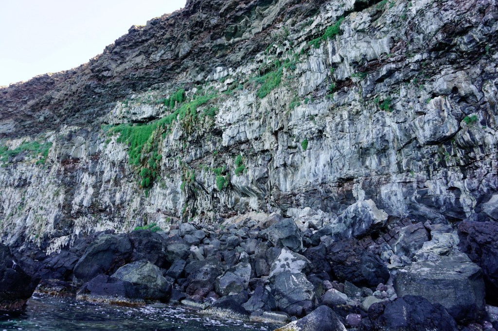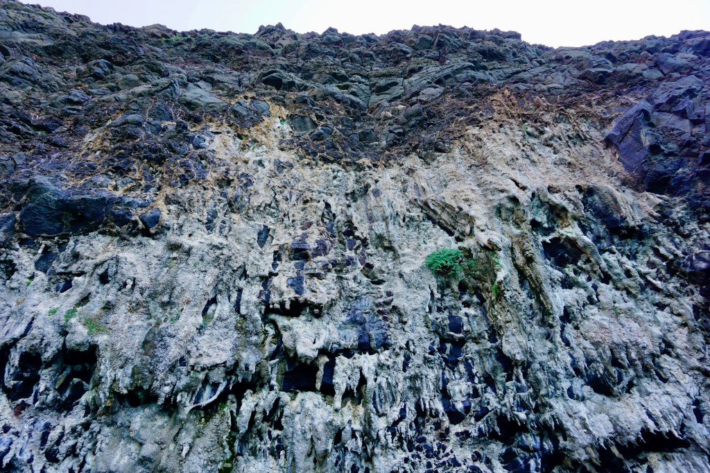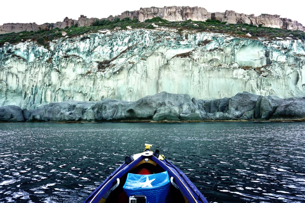 Il sole oggi è spietato, per la mancanza assoluta di vento. Sono alla sua mercé. Arrivato a ridosso di Punta Foghe c’è un’alta scogliera, divisa equamente e perfettamente fra il calcare bianco alla base e il basalto scuro in alto, venato da tracce rossastre trachitiche, forse composte di minerali ferrosi ossidati. L’effetto è spettacolare.