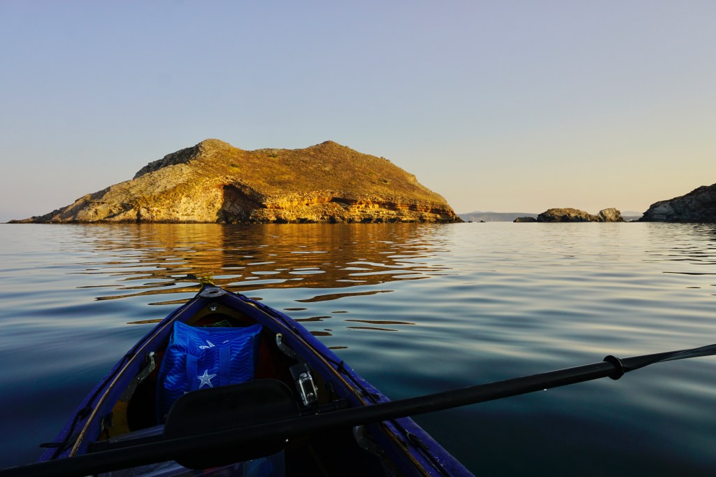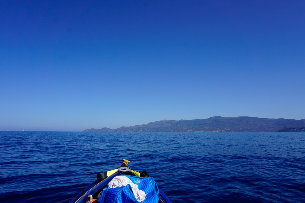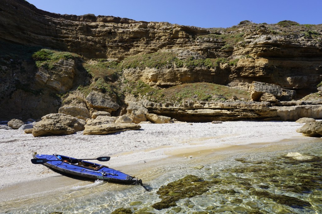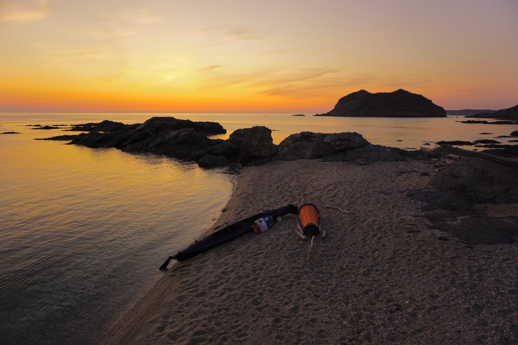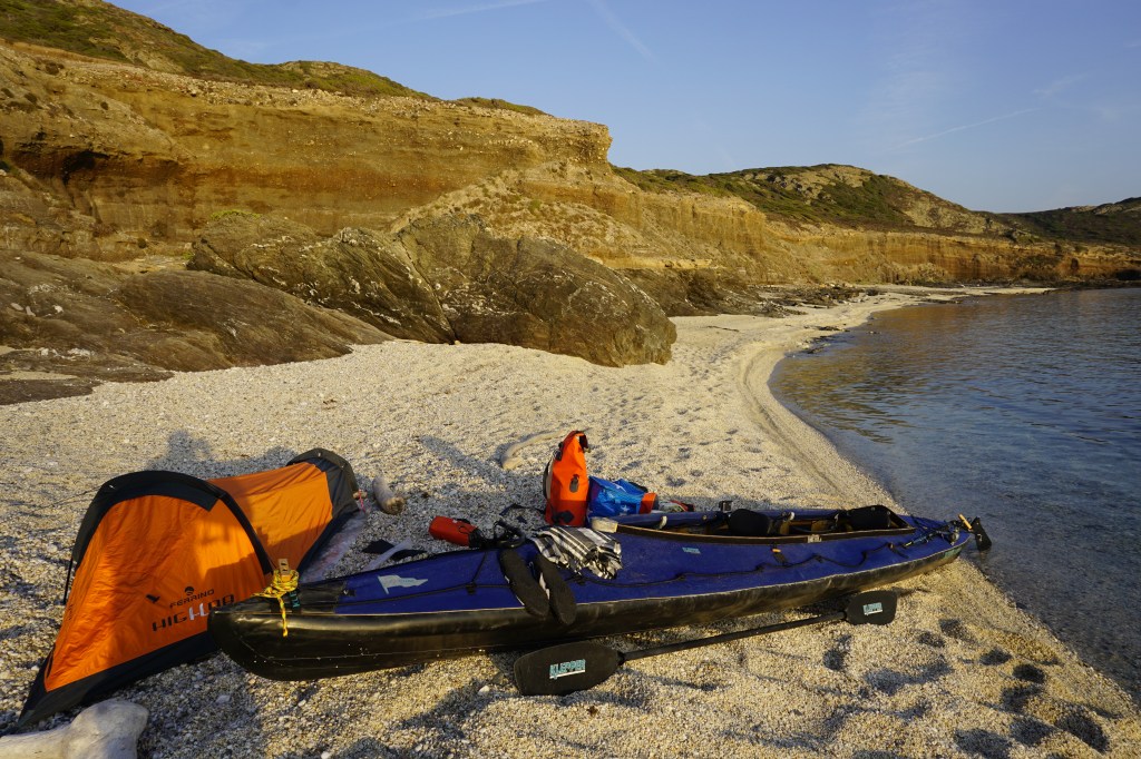 Quando fai una vita scandita dagli elementi, quando il tuo giorno finisce al tuffo del sole in mare, allora anche quello successivo inizia allo stesso modo con il primo chiarore dell’aurora. La prima notte è trascorsa nella tranquillità più assoluta, cullato dal lento respiro marino che alita sul bagnasciuga smuovendo e rotolando la ghiaia di quarzo della spiaggia. Smontare la tenda e impacchettare tutto di nuovo, concedendosi anche qualche minuto per un colazione che mi fornisca energia da pagaiare, è un’ouverture che mi porta via circa un’ora. Meno è quasi impossibile, per fare tutto con ordine e poter ritrovare facilmente ogni cosa al successivo bivacco o durante le brevi pause. È la natura del viaggio in solitaria e a contatto diretto con gli elementi che porta ad essere metodici e organizzati. Il prezzo che si paga per non esserlo è troppo caro. Alle 6:20 son già in acqua diretto verso l’Isola dei Porri, che sfiorerò passando nello stretto canale che la separa dal resto della terraferma.