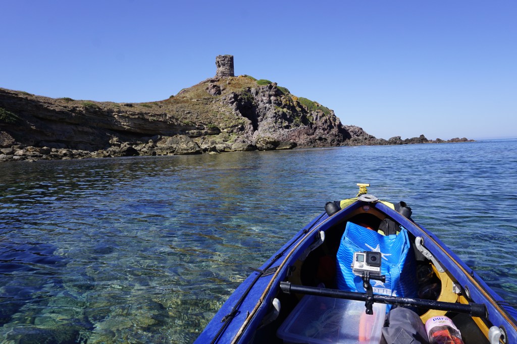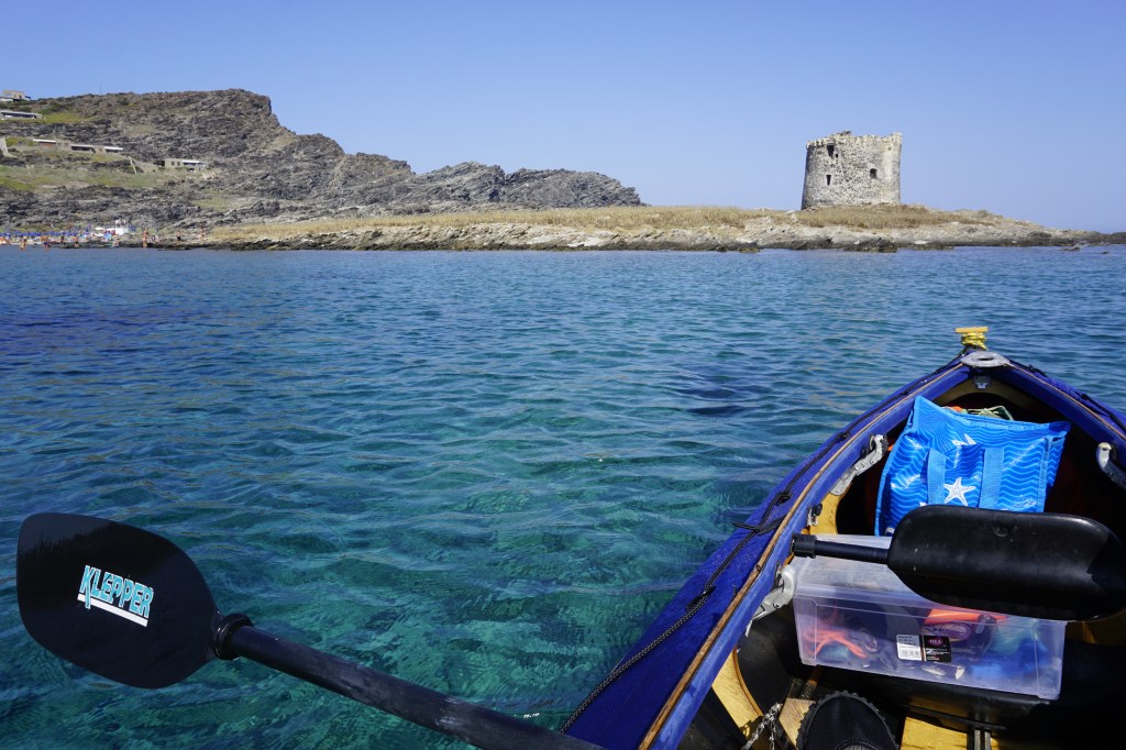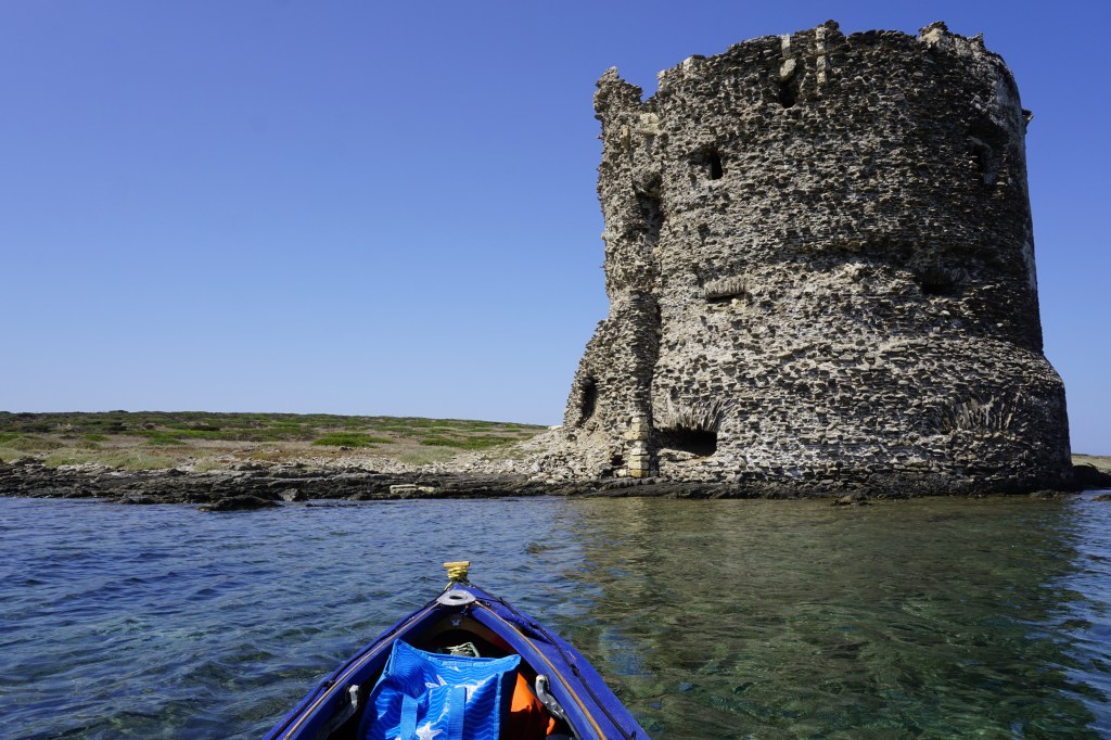 Poi pagaio verso l’Isola della Pelosa, verso la “civiltà” di cui sento già l’inconfondibile frastuono. L’isoletta è dominata dalla torre di avvistamento omonima, l’ennesima torre del sistema di avvistamento e difesa contro le incursioni piratesche dei mori, i famigerati saraceni. A Porto Ferro, il mio campo base, ce ne sono ben tre. Questa è la prima che incontro dopo averle salutate ieri alla partenza.