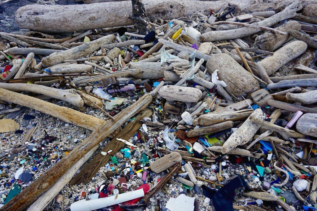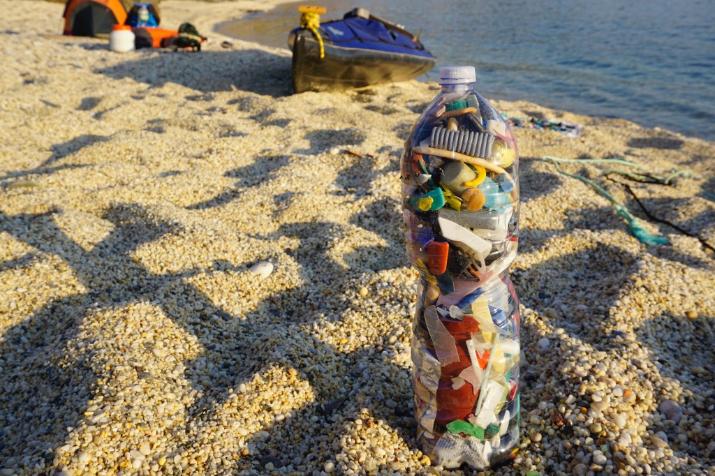 Rimango qui per due giorni, a rilassarmi e a mangiare ricci. Ma soprattutto a darmi da fare. La legna che ieri è stata provvidenziale per scaldare la mia notte, purtroppo non è l’unica cosa trasportata dalle onde del vento di maestrale. Nel punto di congiunzione fra due lingue di sabbia separate da una di roccia si è accumulata una quantità enorme di detriti plastici – di qualunque misura, forma e colore. Dai minuscoli pellet usati come materia prima dall’industria, fino a carene di barche squarciate, enormi imballaggi di polistirolo, paratie, brandelli di sedie, tavoli, cassette… Passando per innumerevoli frammenti di cui è ormai impossibile dedurre la forma originaria.