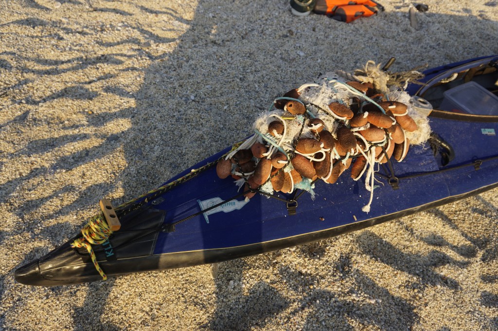Gironzolando sugli scogli faccio anche un altro incontro. Eccola qui. Un’enorme matassa aggrovigliata, fatta di rete da pesca (coi suoi galleggianti di polistirolo), cordame e fili di nylon. Non è facile trovargli un posto sul kayak, ma so che non posso lasciarlo qui. Lo assicurerò alla prua. Mi rallenterà non poco durante il rientro, ma è un prezzo che pago volentieri pur di portarlo via da questo paradiso.