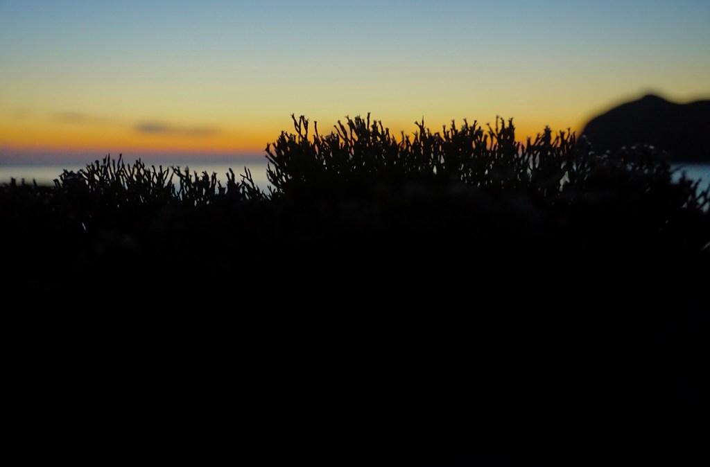 Cala l’ultima notte che trascorrerò qui. Lo spettacolo dell’Isola dei Porri al tramonto, come sfondo per queste piante eroicamente abbarbicate ai massi lontani pochi centimetri dall’acqua, è sublime.