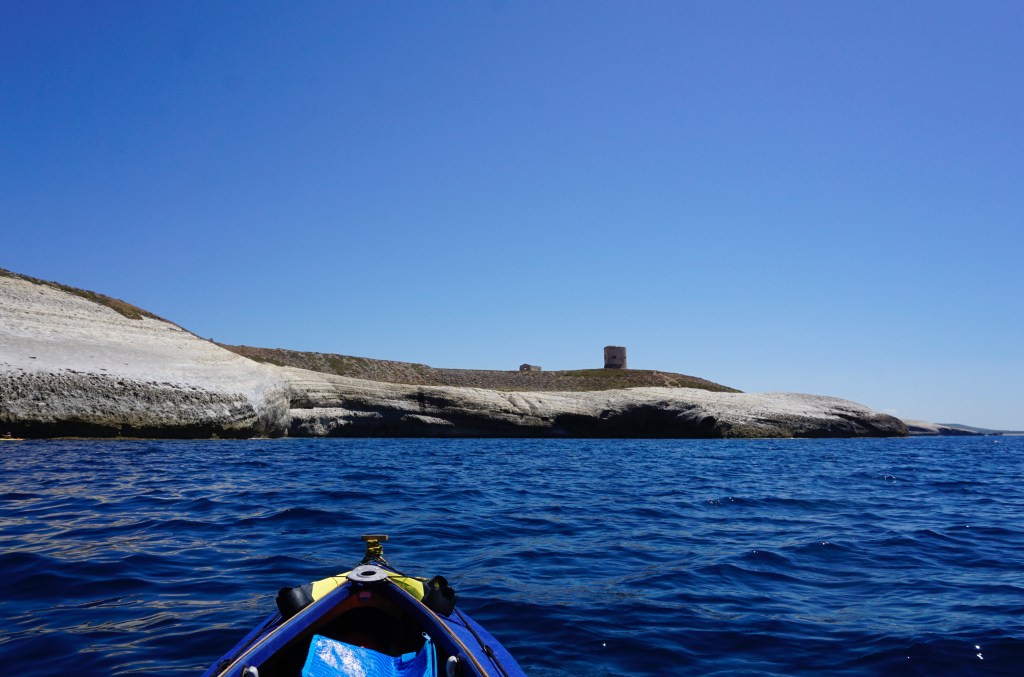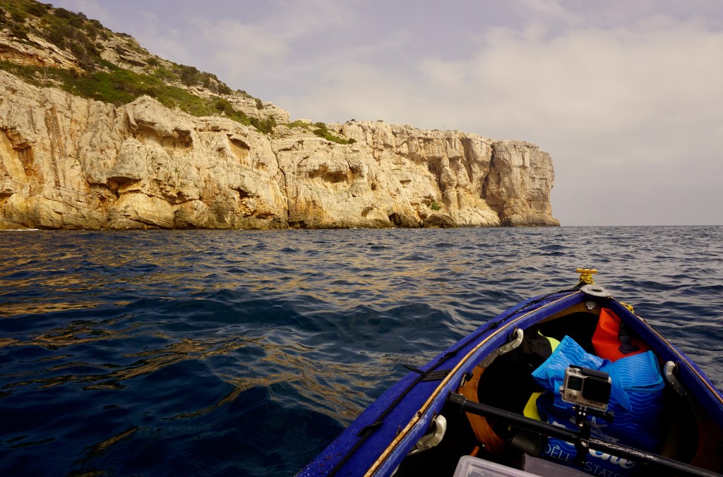 Parto di buon mattino diretto verso nord, e costeggio il promontorio accompagnato da una calma assoluta e un mare piatto, condizioni piuttosto rare lungo questa costa normalmente sferzata dal maestrale. Punta Lu Caparoni e Lu Cornu dominano dall’alto la mia pagaiata veloce e regolare. Approfitto appieno della bonaccia per filare rapido e mettermi miglia alle spalle. Quando si verificano queste condizioni, infrequenti per una costa, il kayaker deve sfruttare la rara occasione per portarsi avanti il più possibile lungo la rotta. È impossibile sapere quanto durerà, ma una cosa è certa: non durerà. E allora eccomi a pagaiare dannatamente per raggiungere la prima tappa di giornata.