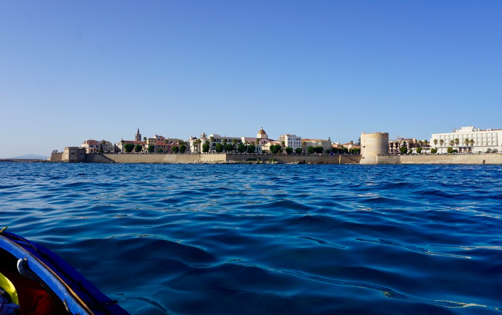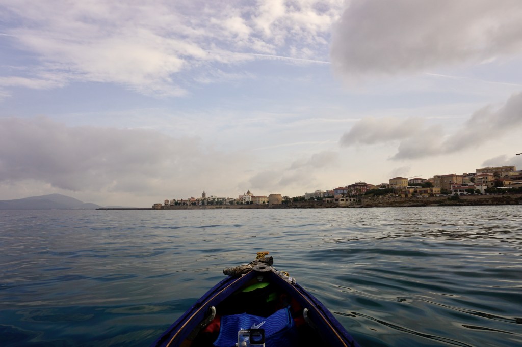 E qui cambia tutto. La rada di Alghero è per le onde come una culla. Le accoglie da più direzioni, e quelle incrociandosi crescono. Al termine del giorno, poi, si sono ormai sommate le une alle altre, e il momento è quello peggiore. Più mi inoltro nella rada, più pagaio con difficoltà crescente. Sono ormai di fronte alla città.