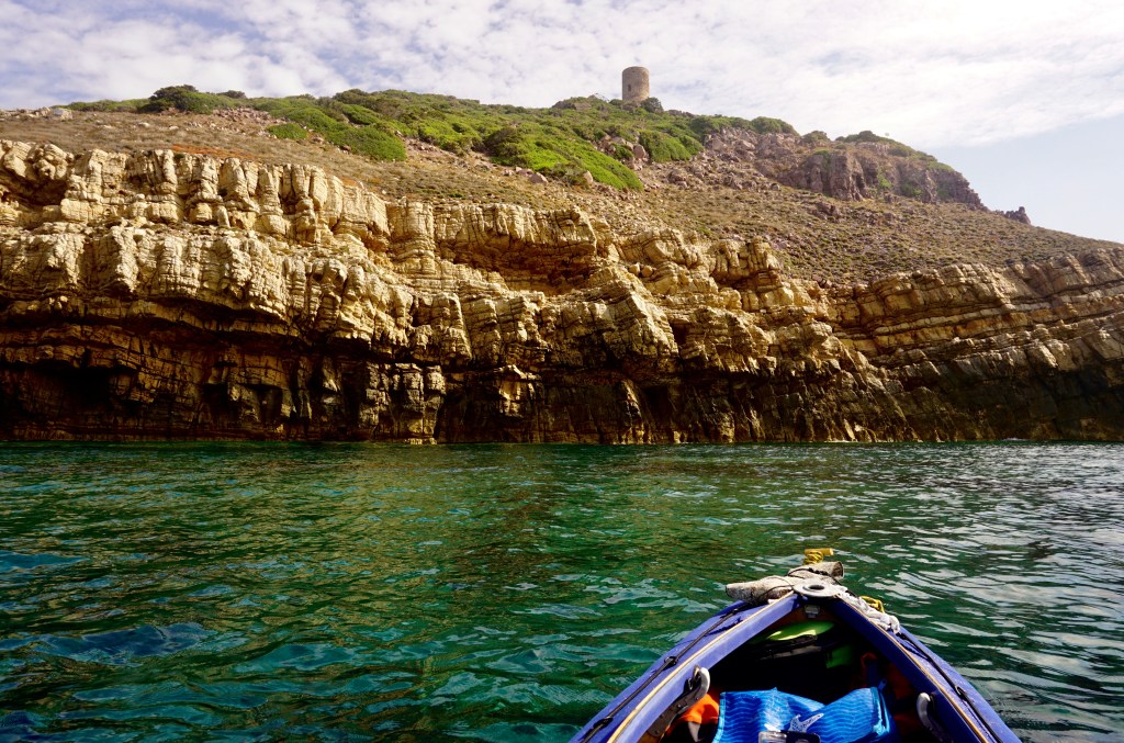 Il groppo bianco è ormai passato e la giornata si indirizza sui binari meteorologicamente tranquilli di metà Agosto. Lasciato a babordo Porto Alabe, incontro una nuova torre aragonese. Questa guarda dall’alto una piccola spiaggia, rendendo il quadro veramente magnifico. È la Torre della Columbargia, vecchia di circa cinque secoli, e viste le condizioni pare sentirli tutti.