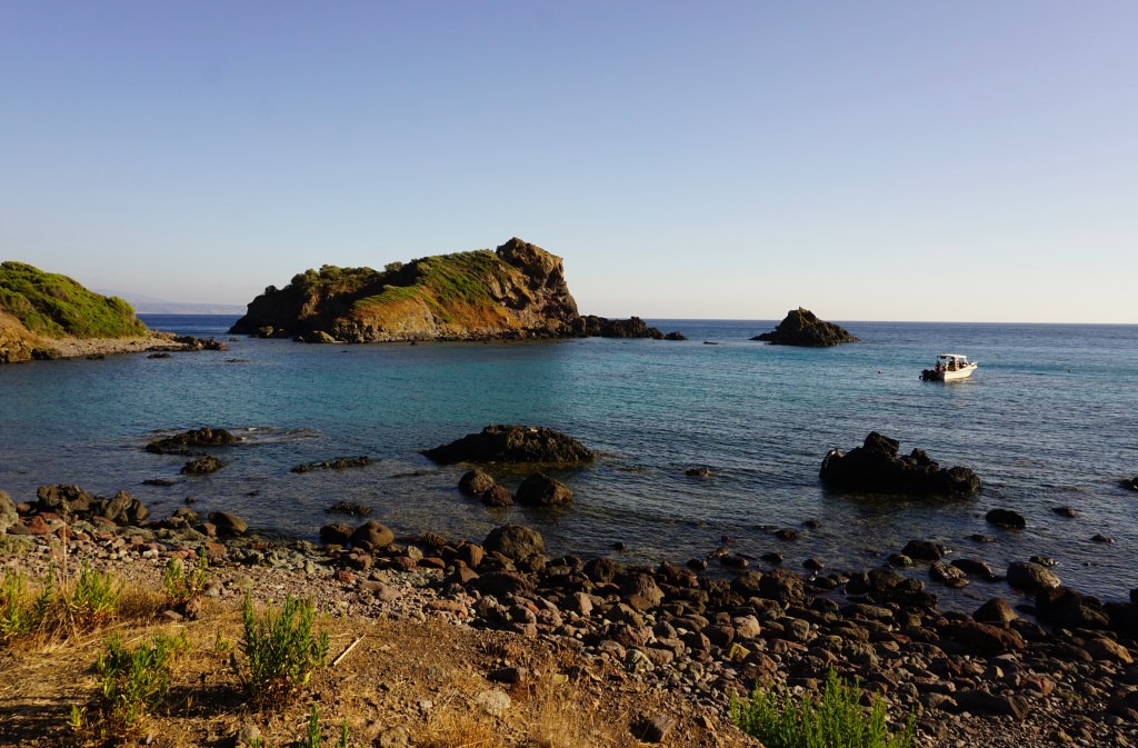 Porto Mànagu è una spiaggia deliziosa di grossi ciottoli ben levigati dall’acqua e dal continuo sfregarsi l’uno con l’altro. Nel lato verso Bosa è come protetta e sorvegliata da un tozzo isolotto, il suo gendarme personale. Sarà questo il mio ricovero per stanotte: anche se giungo qui con ancora tante ore di luce a disposizione, la bellezza del luogo e la protezione che mi promette mi convincono a non proseguire. Ho il tempo di fare una bella nuotata ed esplorare il fondale sabbioso pieno di pesci.
