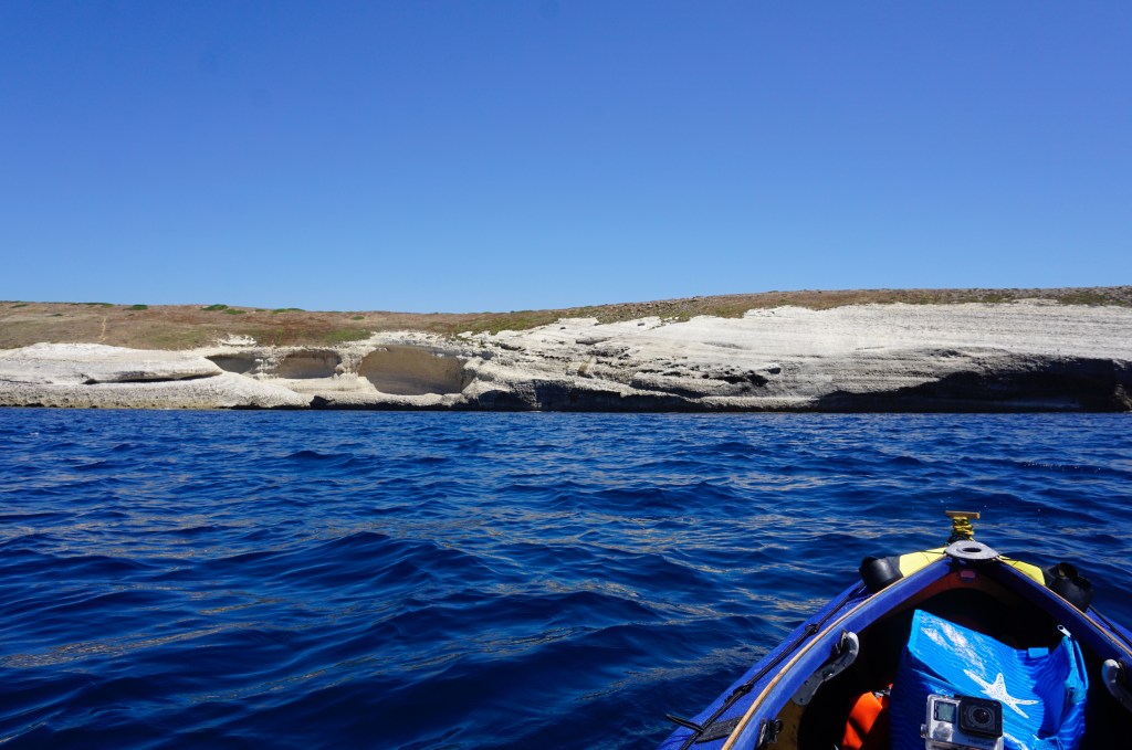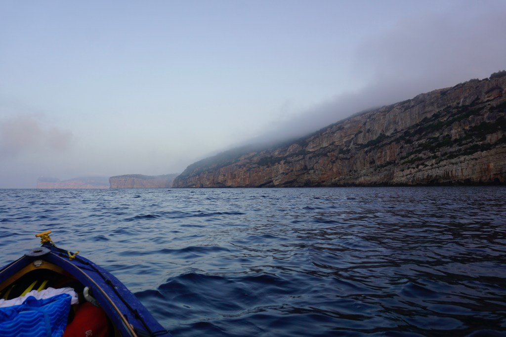 La paura di trovare Capo Caccia già circondato da onde pericolose al levarsi della termica, mi fa svegliare prima di tutti gli altri giorni. Oggi sono in acqua già alle 5:30 diretto verso Punta Giglio e poi verso le alte scogliere che rimarranno pur sempre quelle più maestose di tutto il viaggio. Punta Giglio è ancora immersa nella nebbia mattutina, oggi particolarmente densa.